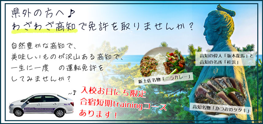 高知の中西部に位置する自動車学校。個別送迎も充実。低料金で安心・親切